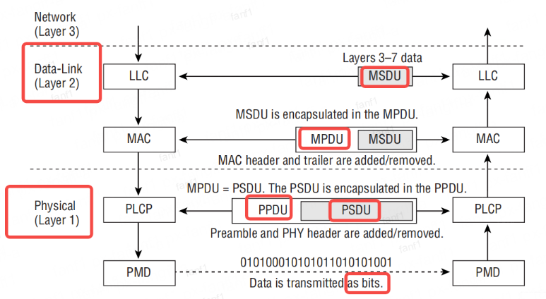 - 将 PPDU 转换成实际的 比特流(0101…),通过无线电波发送出去。
